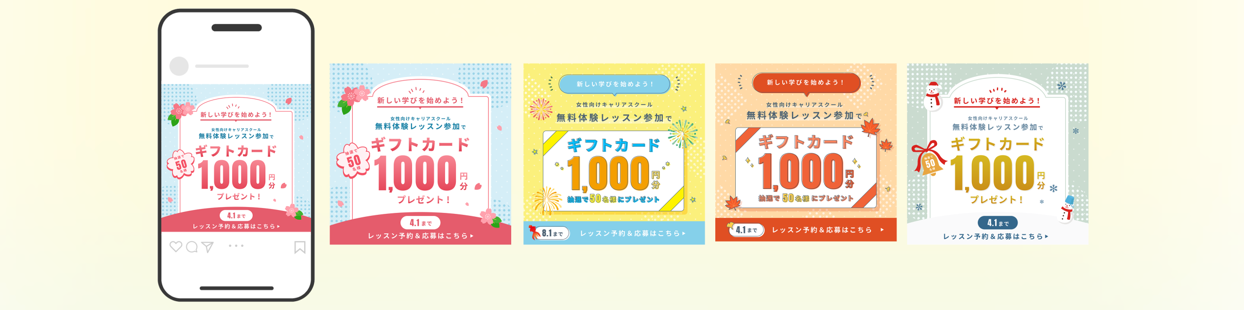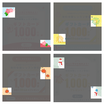 Webデザインスクールの課題で、季節に合わせた4種類のバナーを制作しました。コピー文、情報構造、一部あしらい素材(桜、紅葉、雪だるま)は事前に提供を受けた上で制作。SNS、Web広告を想定媒体としています。