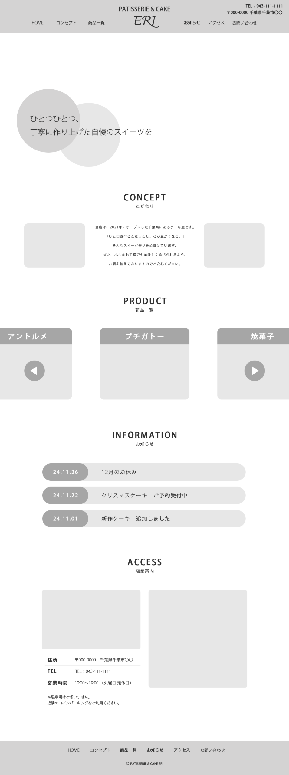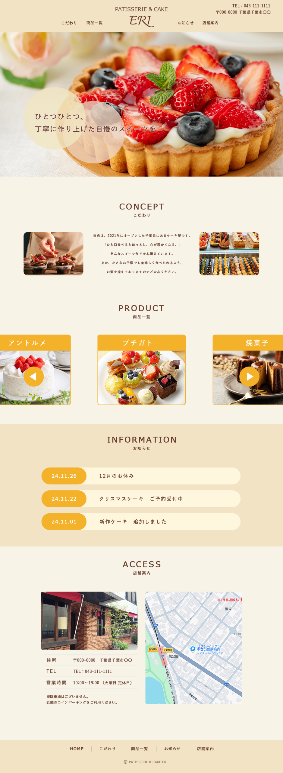 お店からのお知らせや商品情報、アクセスなど、製菓店を訪れる前に確認すべきことが一目で分かるようにしたい。