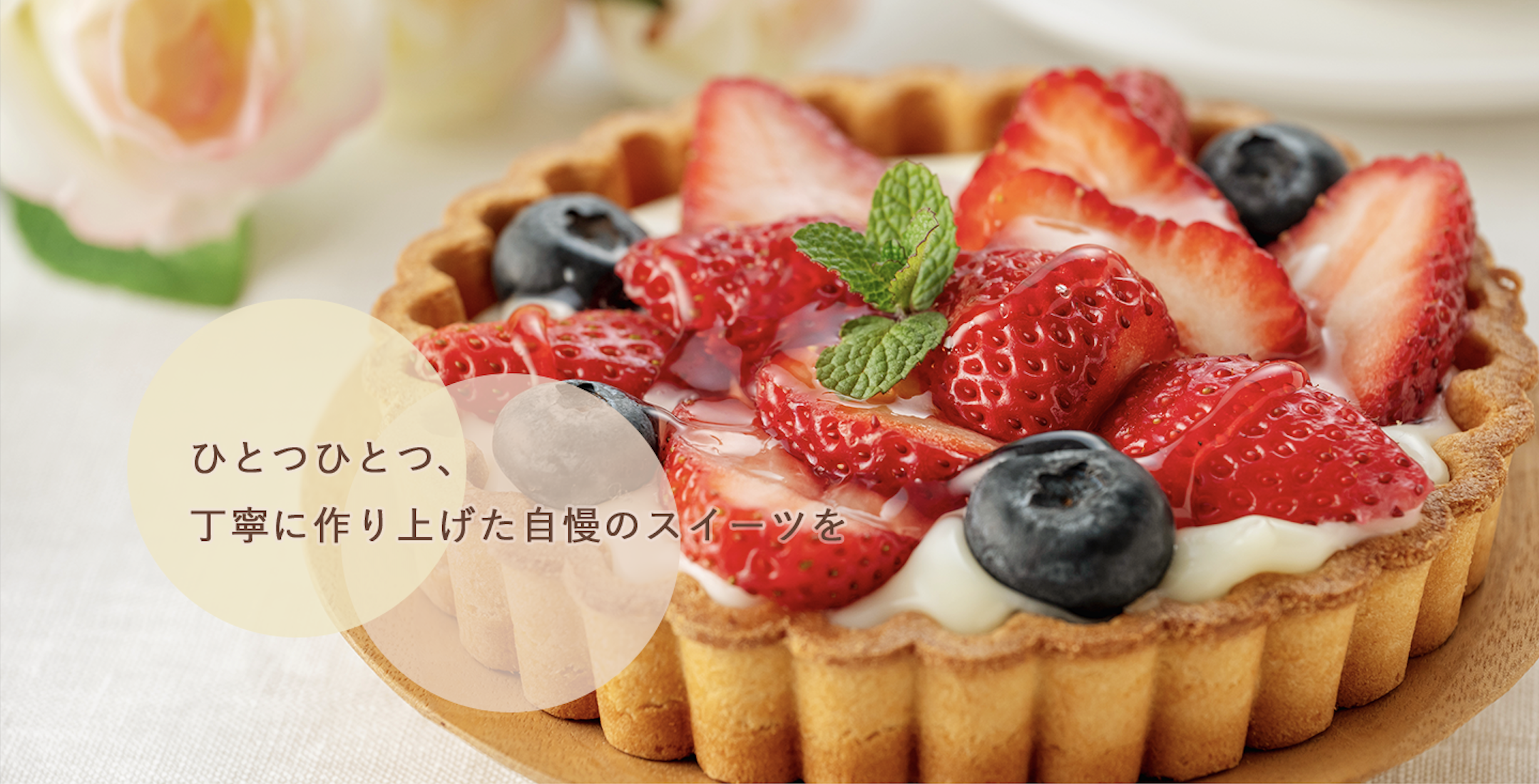一目で製菓店のホームページだと分かるよう、商品をメインビジュアルに置きました。解像度が高い写真を使用し、商品そのものの美味しさが伝わるようにしました。キャッチコピーの箇所も商品を邪魔しないよう、透過させています。
